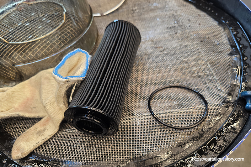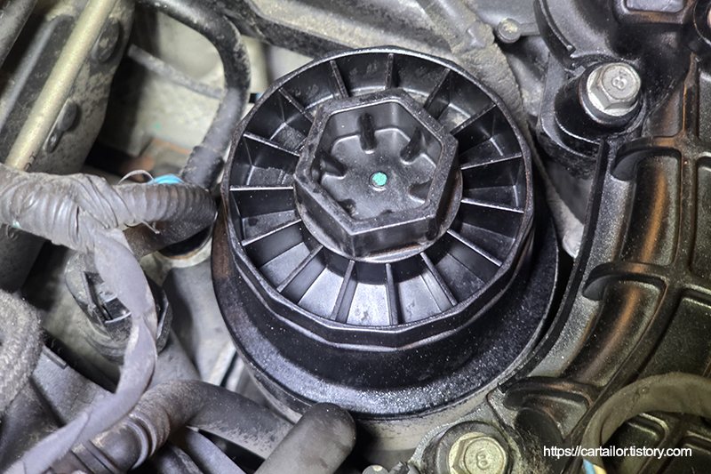 세척 및 건조가 끝난 필터캡에 신품 오링, 필터를 결합합니다. 모든 접촉면에 신유를 바른 뒤, 토크렌치를 이용해 규정 토크로 체결합니다.