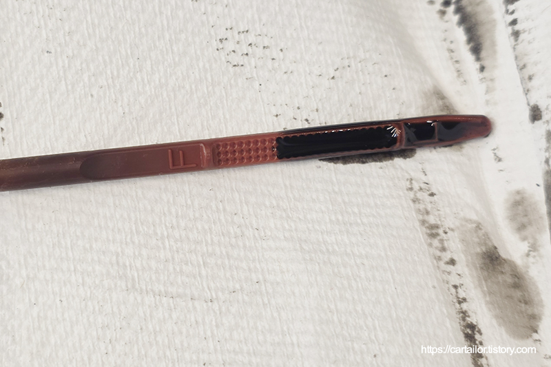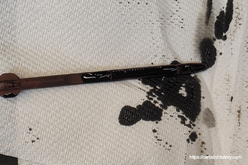 웜업 상태에서 시동을 끄고 수분 후 딥스틱을 뽑아 레벨을 체크합니다. 교환 주기를 감안해 의도한 세팅대로 잘 충진되었습니다.