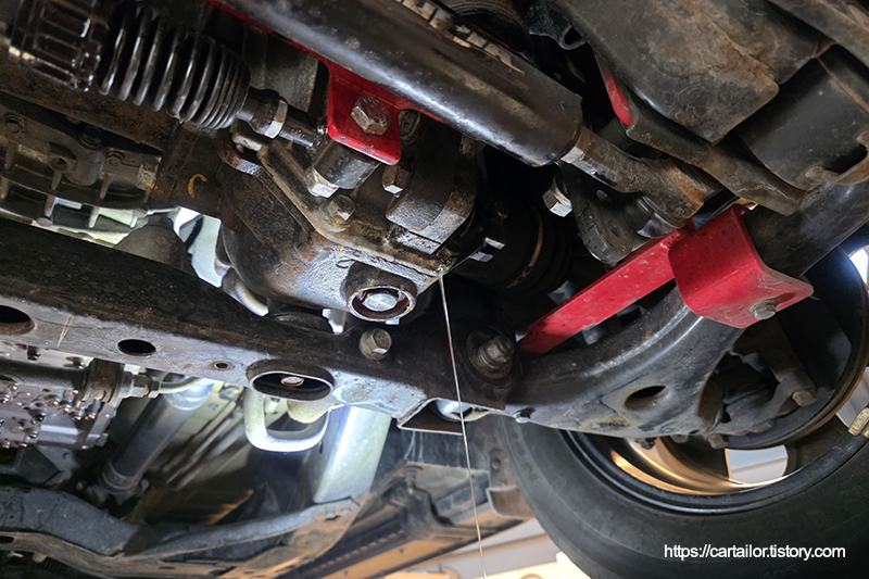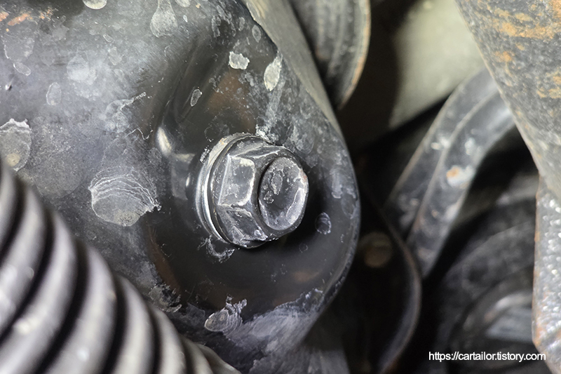 시운전을 다녀온 후 차량을 올려 하부를 확인합니다. 작업한 부위 모두 깨끗합니다.