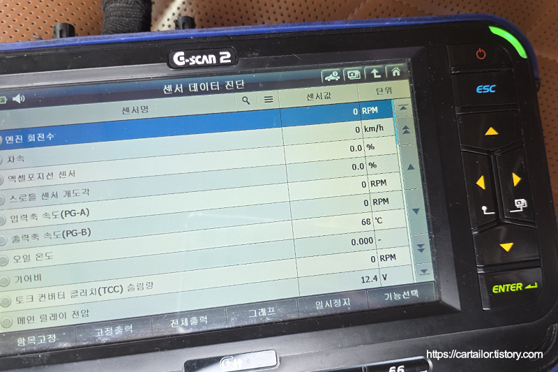 레벨링 작업을 감안한 용량의 신유를 주입 후, 시동을 걸어 변속을 진행합니다. 변속기 오일 온도가 일정 구간에 들어섰을 때, P단에 위치 후 레벨링 작업을 시작합니다.