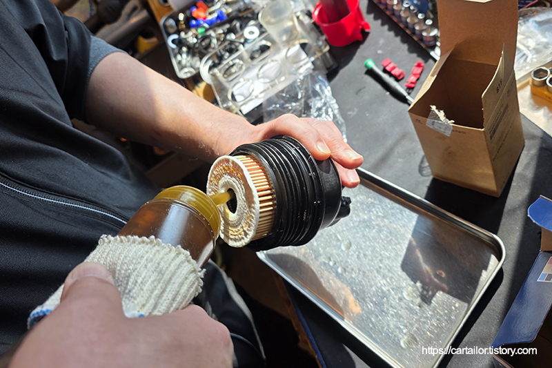 서비스커버를 탈거 후, 오일필터 및 기존 엔진오일을 제거합니다.
