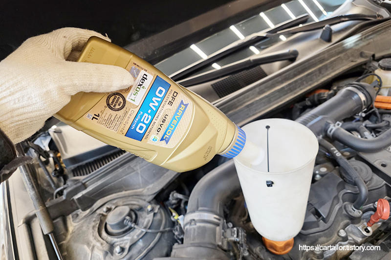 주입할 엔진오일은 라베놀 사의 플래그쉽 USVO라인의 DFE 0W-20제품으로, 높은 효율과 경쾌한 엔진구동 그리고 우수한 저온유동성과 같은 저점도 엔진오일 특유의 장점에 충실하면서도, 텅스탠 기반의 첨가제와 PAO 및 에스테르가 사용되는 베이스유로 높은 수준의 엔진보호와 우수한 정숙성까지 양립하기 어려운 부분들을 골고루 함께 누릴 수 있는 최고급 합성유입니다. 최근 쉐보레 엔진오일 규격 중 가장 최신인 DEXOS1 GEN3 공식 인증 업데이트가 완료되었으며, API 기준 SP 최신 규격입니다.