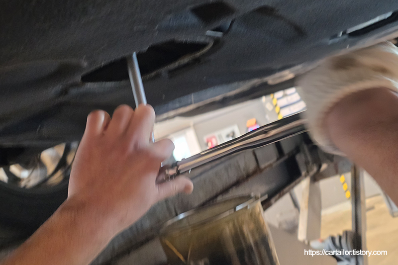드레인플러그와셔를 신품으로 교환합니다. 오일 배출이 완전히 끝났으면 플러그를 손으로 돌려준 뒤, 규정 토크로 조여 마무리합니다.