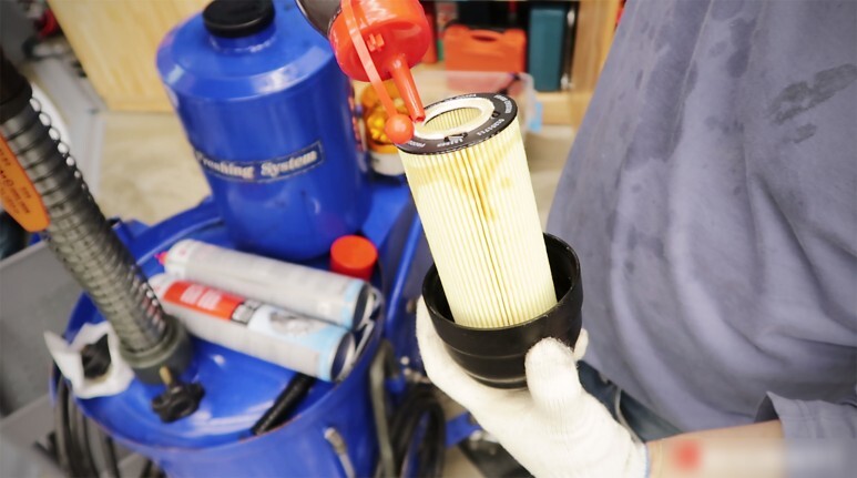 신품 오일필터 엘리먼트를 케이스에 장착 후 손으로 체결 한 다음 마무리는 토크 렌치를 이용해 규정토크로 체결해줍니다