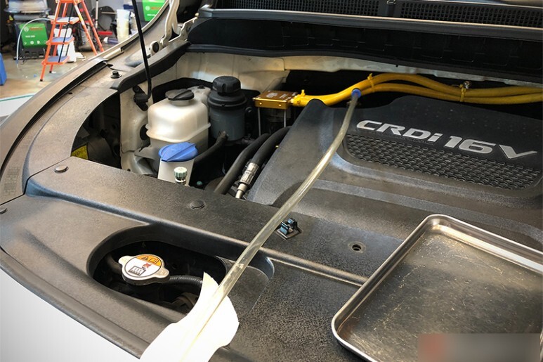 안전한 잔유제거를 위한 에어어답터 삽입 후 차를 바퀴째 들어올립니다.