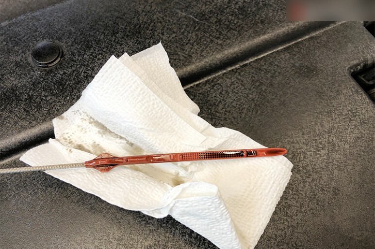 시동 후 차량을 방치하여 유온이 오를 때 까지 기다립니다. 디젤엔진은 높은 열효율로 인해 온도가 오르는 시간이 가솔린 및 LPG 차량대비 더 오래 걸리게 됩니다. 열간상태가 되면 시동을 끄고 5분간 대기 후 레벨을 확인합니다. 정확하게 60%에 잘 주입이 되었습니다. DPF 재생을 위해 인젝터에서 후분사되는 연료가 크랭크케이스로 스며들어 엔진오일과 희석되어 증가하는(정상적인 현상) 엔진의 경우 증가폭을 감안하여 FULL선 가까이 주입하지 않습니다.