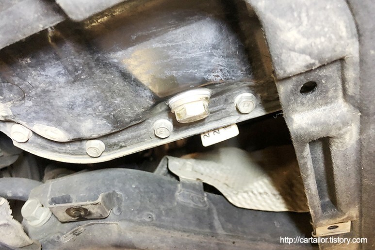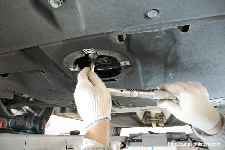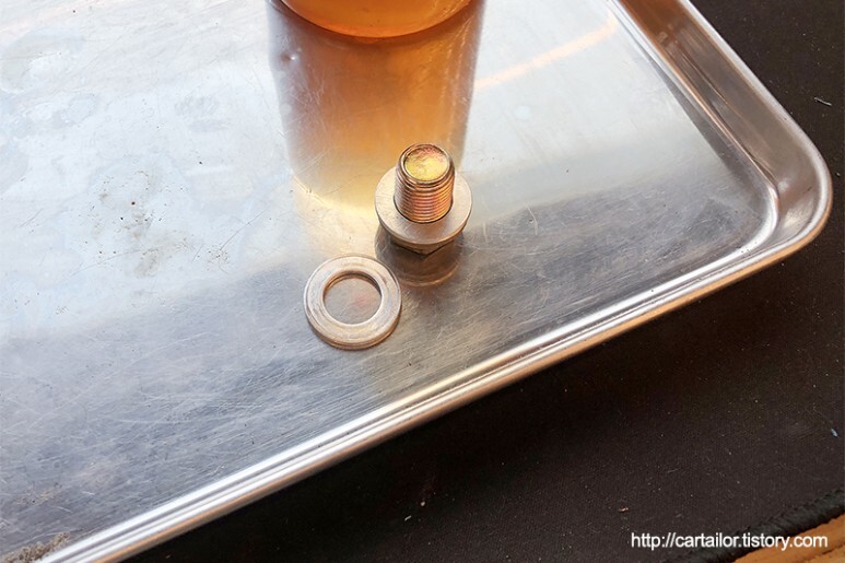 배출이 완료되면 드레인볼트 와셔를 신품으로 교체 후 손으로 살살돌려 끝까지 꽉 잠궈줍니다.
