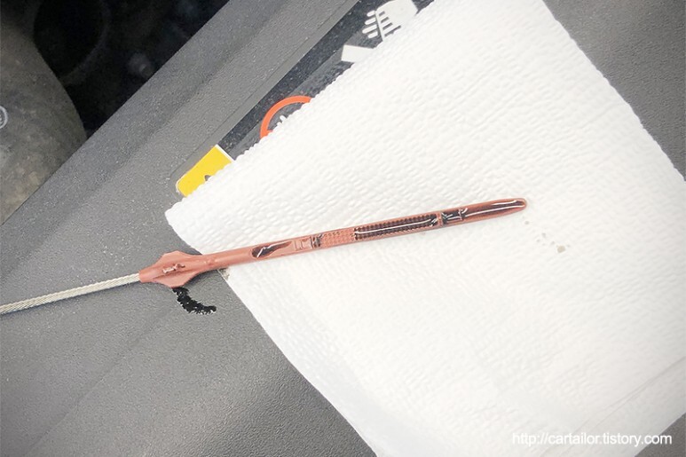 주행직 후 열간상태에서 시동을 끈 다음 10분이 경과 하였을 때 확인한 엔진오일 레벨입니다. 정확하게 FULL선을 유지하고 있습니다.