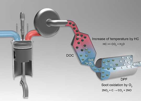 보통은 DPF 앞 단에는 일반적인 휘발유 차량처럼 배출가스에 있는 CO, HC, NOx를 화학적으로 정화하는 촉매(LNT 혹은 DOC로 불리기도 함)가 위치하여 배출가스에 대한 전처리가 우선적으로 이루어 지며, 이렇게 전처리 된 배출가스 중 제거되지 않는 미세먼지를 한번 더 걸러주기 위한 후처리 장치 개념으로 DPF가 위치합니다.