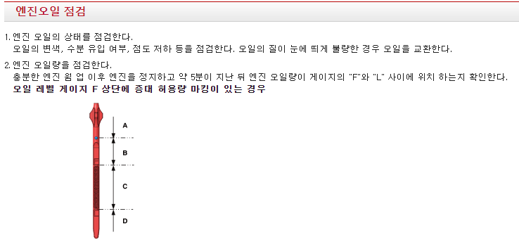 위의 사진은 기아차 메뉴얼에서 발췌한 내용으로, D구간은 오일부족, C구간은 정상, B구간은 과다를 나타내고 있습니다. 뭐 일반적인 딥스틱 같은데요, 그런데 자세히 보면 A구간과 B구간 사이에 일반적인 가솔린 차량의 딥스틱에서 못보던 작은 양각점을 표기해 놓았는데요, 이게 바로 증대허용량 마킹점 입니다.