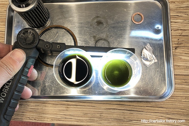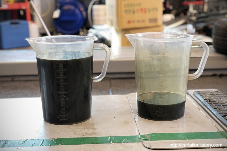 좌측이 최초 배출 분, 우측이 레벨링시 오버플로우 된 오일입니다.
