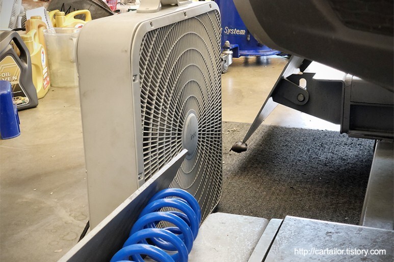 유온이 냉간 수준까지 식으면 이제 레벨링을 진행할 수 있습니다. 그렇다고 낮은 레벨링 규정온도로 인해 시간적 여유가 많은 것도 아닙니다. 유온 상승이 굉장히 빠르거든요. 그래서 시동을 걸어놓고 차를 올리는 시간도 아끼기 위해, 애초에 차를 올려 놓고 모든 준비를 마친 다음, 사다리를 타고 리프트에 올라가서 시동을 걸고 변속을 수차례 진행합니다.