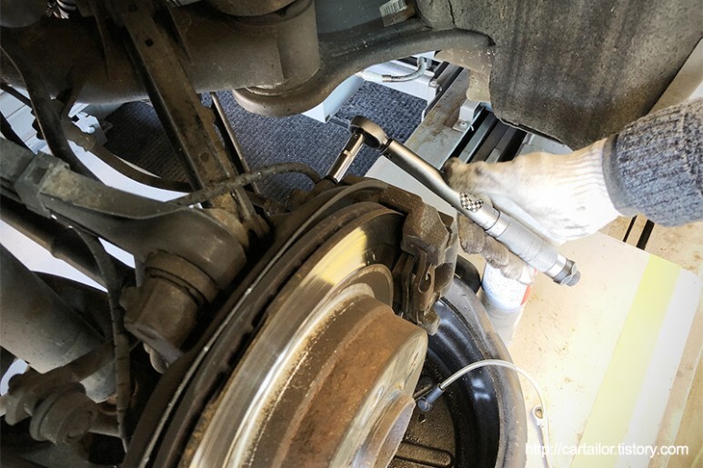 브리딩볼트는 수공구로 새지 않을 정도로 충분히 체결 후 브리더 호스 제거 후 토크렌치를 사용하여 규정토크로 정확하게 체결합니다. 모든 캘리퍼는 시운전 후 누유 여부확인이 용이하도록 브레이크 파츠크리너로 작업 흔적이 남지 않도록 깨끗하게 세척합니다.