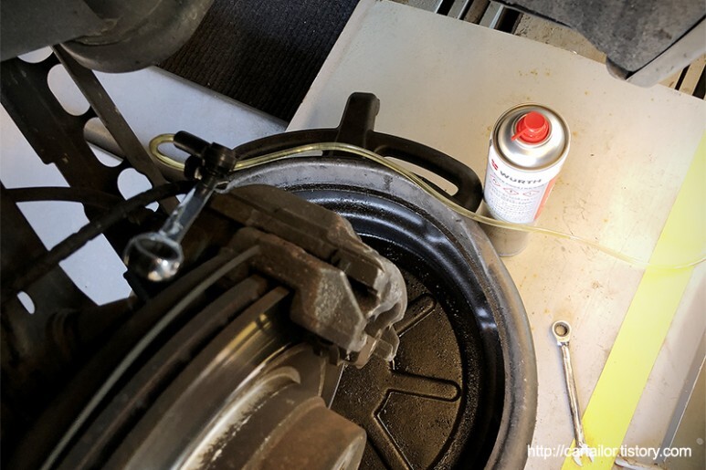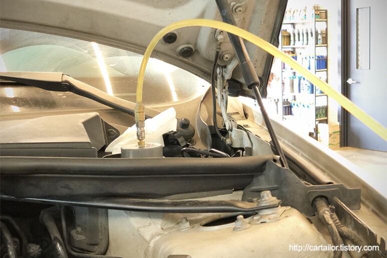 브레이크액 주입 아답터를 장착 후 신유를 걸어 브레이크 라인에 압력을 걸어 줍니다.