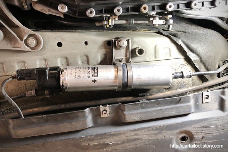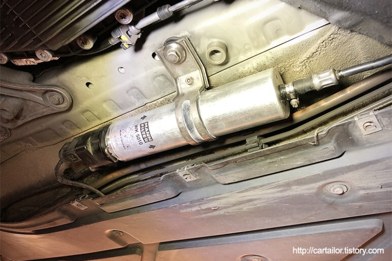 시동을 걸어 줍니다. 시동이 걸린 상태에서 차를 올려 연료필터 피팅부를 잘 확인해 봅니다. 누유나 특이사항 없이 깔끔합니다.