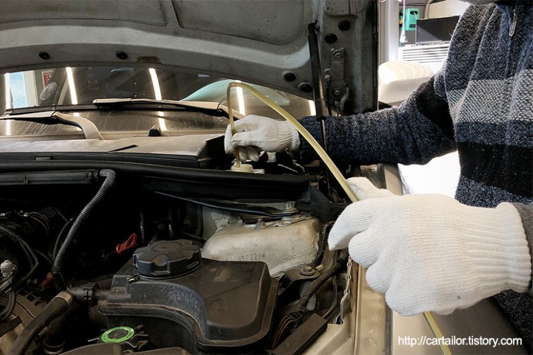 일단 교체시기가 언제인지 기억을 못 하실 정도로 오래된 브레이크 액을 레저버에서 석션합니다. 역시 붉은 빛이 살짝 도는 진한 브레이크색이 교체주기가 한참 지났음을 잘 보여주고 있습니다.