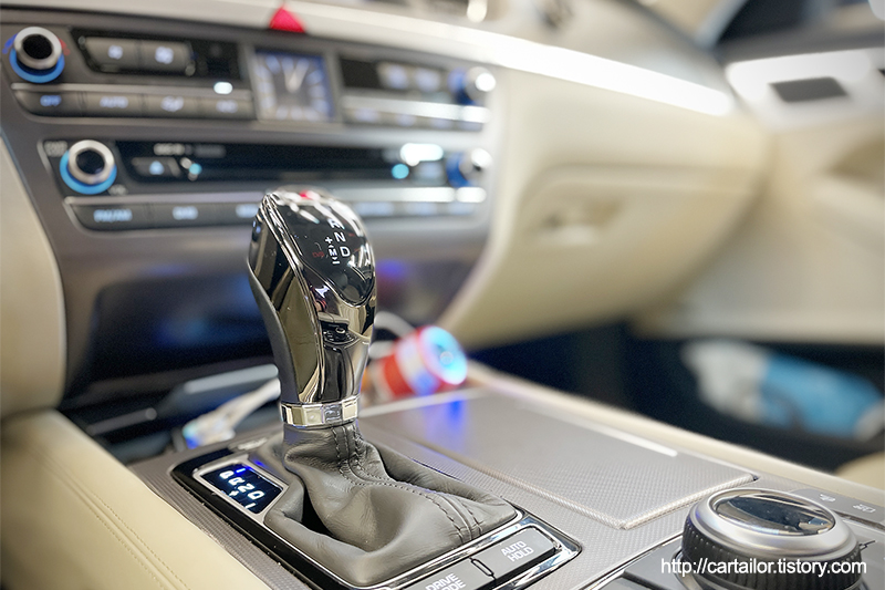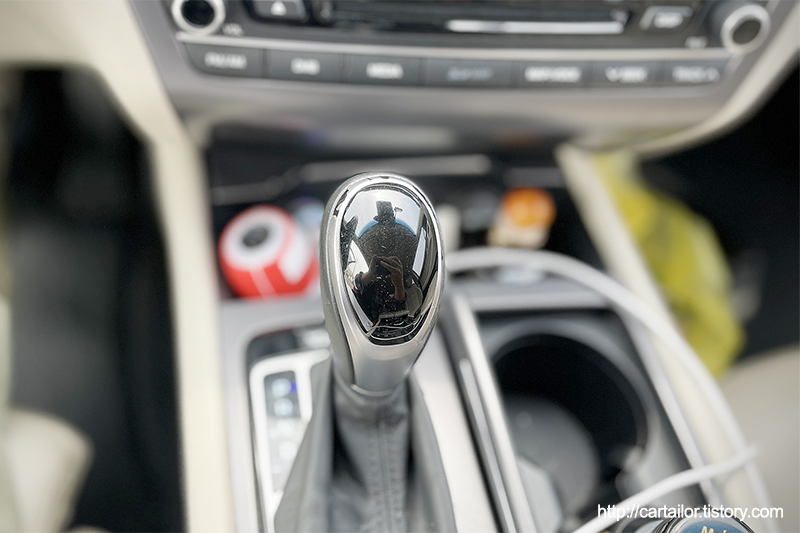 실내로 들어오면 바로 눈에 띄는 순정 기어봉의 모습입니다. 아무리 잘 포장하려 해도.. 정말 못 생겼습니다. 그래도 제네시스인데 애초에 차급에 걸 맞게 전자식 기어봉으로 출시했으면 어땠을까 싶네요.