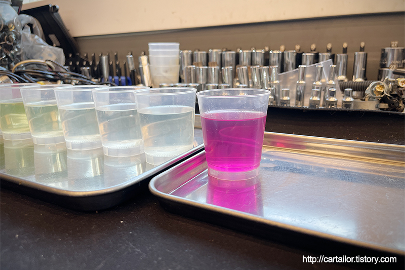 해당차량의 경우 규격에 맞지 않는 초록색 냉각수가 주입되어 있었는데요, 규격에 맞는 냉각수로 바로 잡기 위해서는 기존 냉각수를 완벽하게 씻어내는 과정이 필요하기 때문에, 일반적인 냉각수 교환보다 시간이 더 많이 소요되게 됩니다.