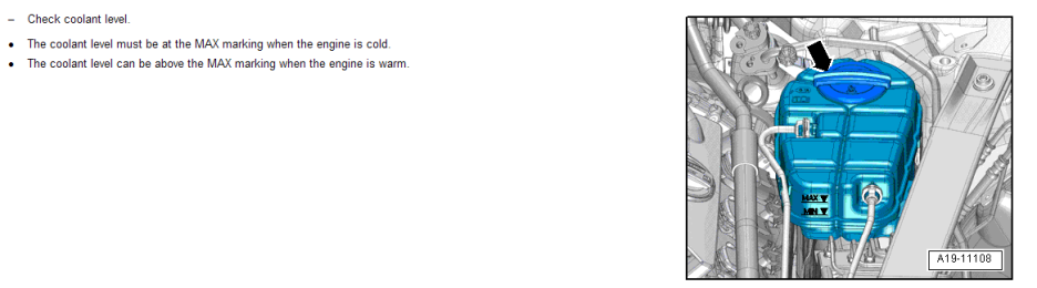 딱 맞게 정량주입이 잘 되었습니다. 에어도 잘 제거 되었구요. 아우디의 경우 냉간상태 기준, MAX라인에 위치하고 열간시 MAX를 넘어가는게 정상이라고 지침서에 명시하고 있습니다. 즉 저 MAX/MIN 라인은 냉간시 운행 전 확인했을 때 기준입니다. 만약, 열간상태에서 MAX아래에 위치한다면, 뭐 큰 차이야 있겠냐만, 냉각수가 약간 부족한 경우가 되겠습니다.