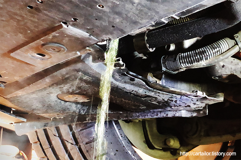 차를 올리고 기존 냉각수를 배출합니다. 비중계로 보니 -60도가 찍히는데요, 증류수와 혼합해서 사용해야 함에도 불구하고 원액 그대로를 주입한 것 같습니다. 비중이 높으면 냉각성능이 오히려 저하됩니다.